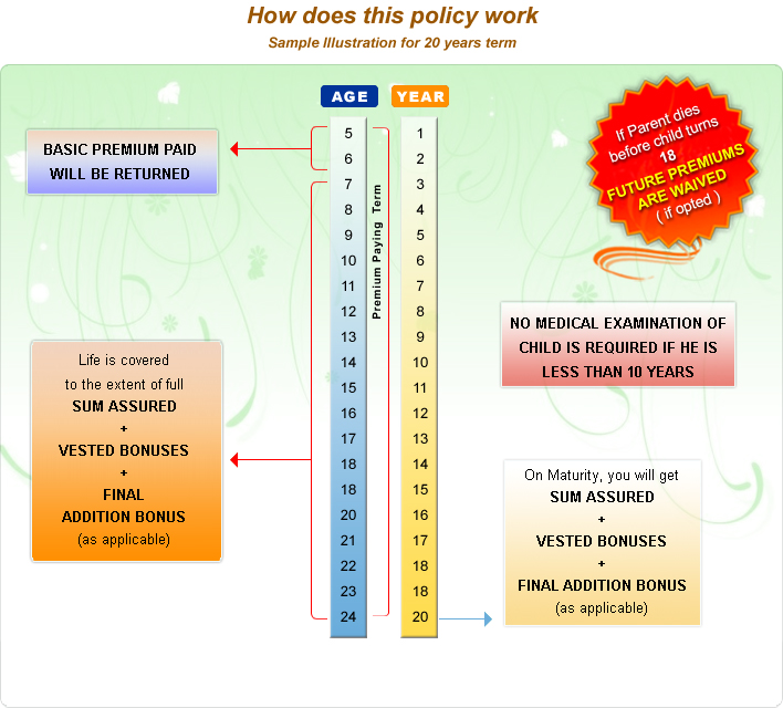 - Life Cover: Full Sum Assured + Bonus + Final Addition Bonus (as applicable). Life cover starts at age 7 or 2 years from date of commenecement whichever is later